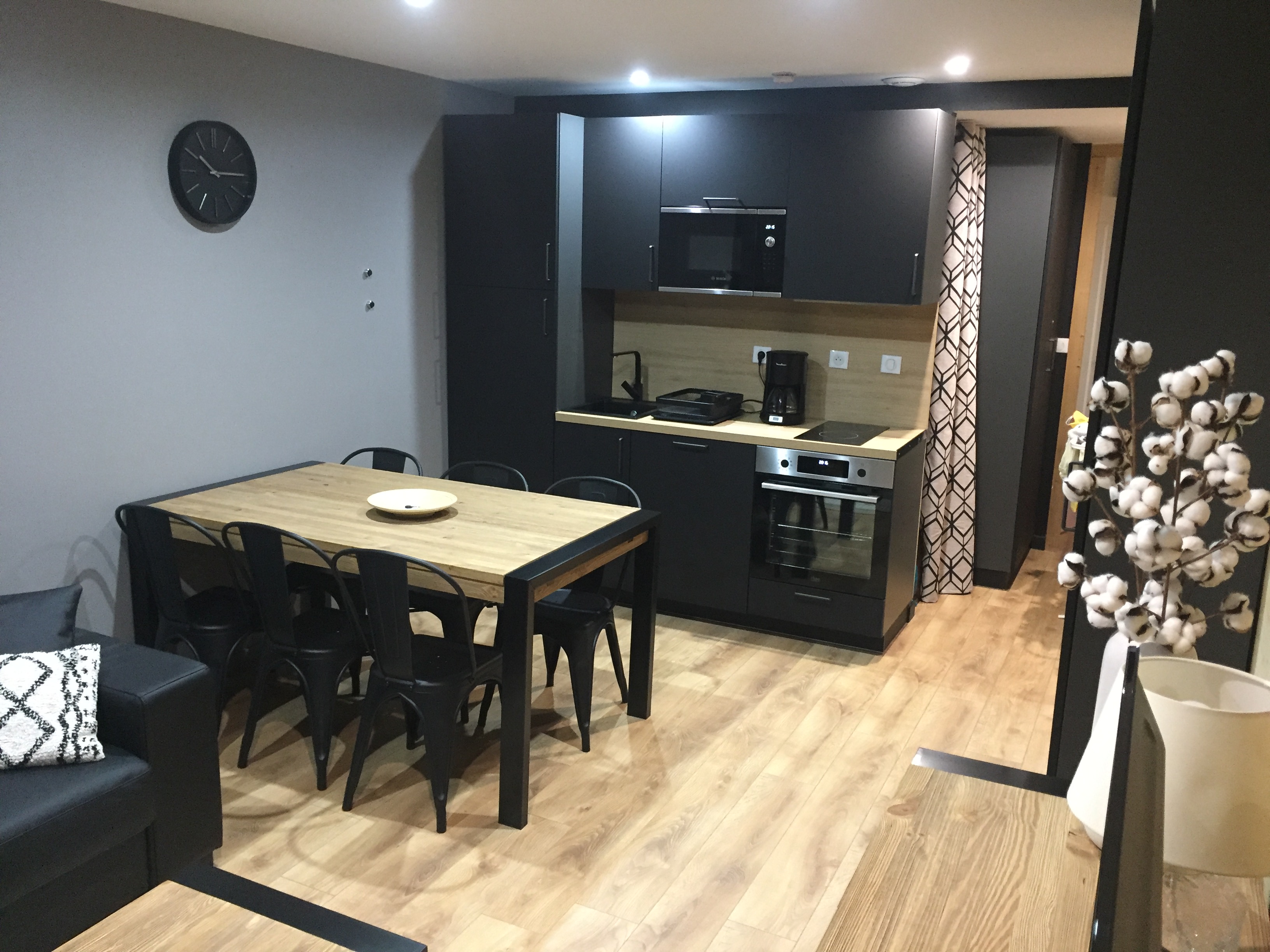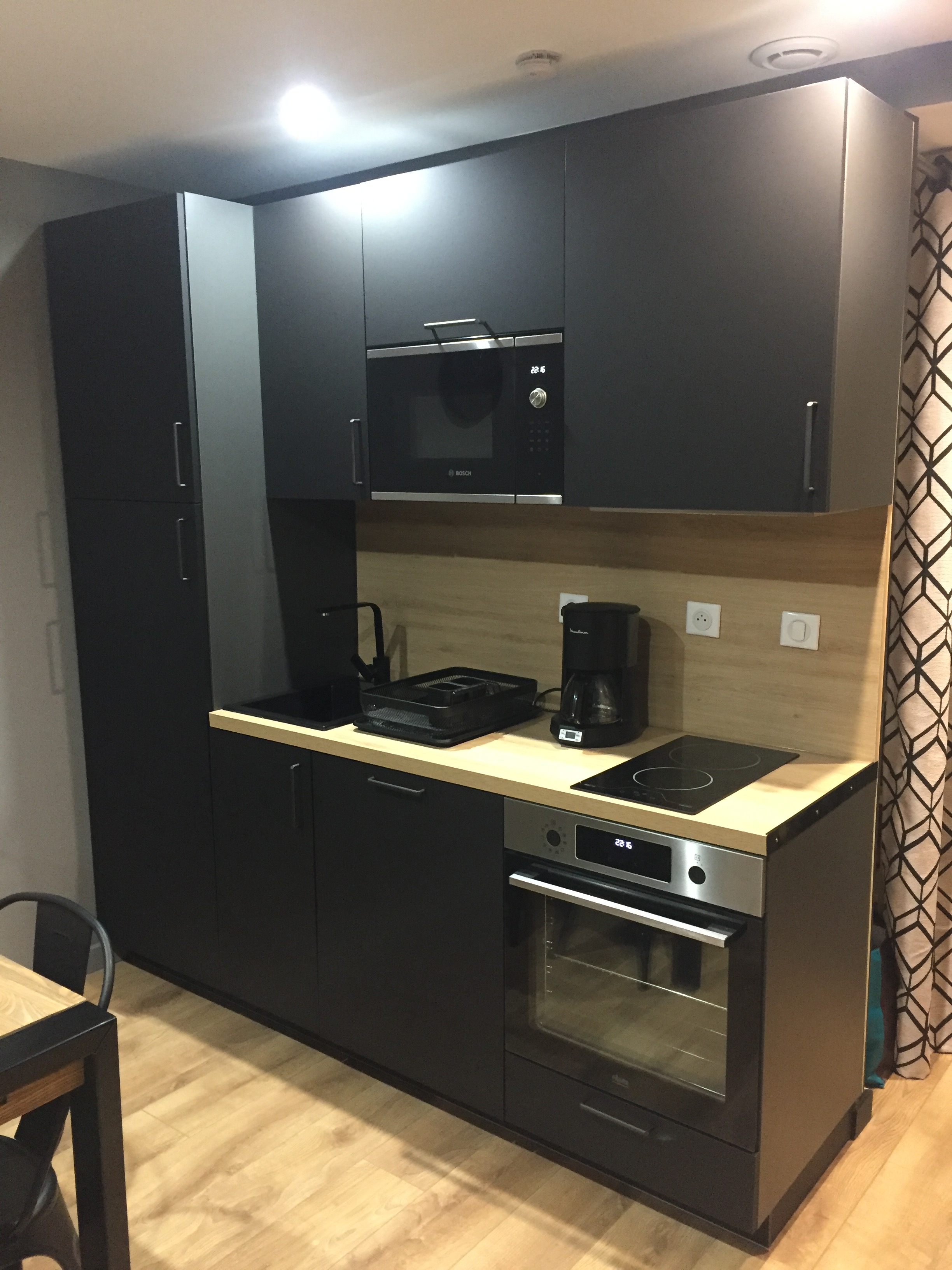 cuisine ouverte sur salon avec plaque induction, lave vaisselle, réfrigérateur avec freezeur, micro onde, four, grille pain, cafetière, appareil à raclette, bouilloire.