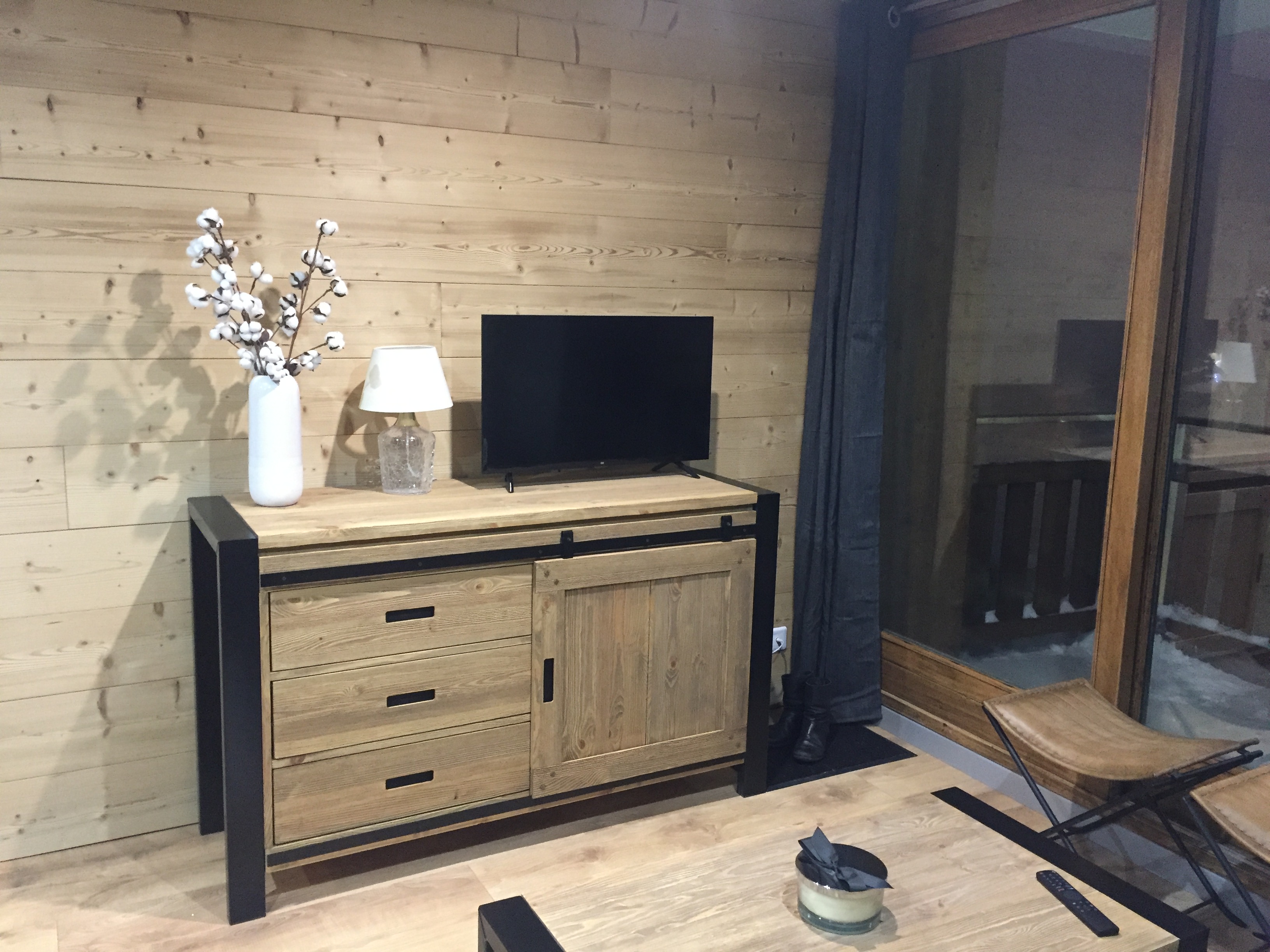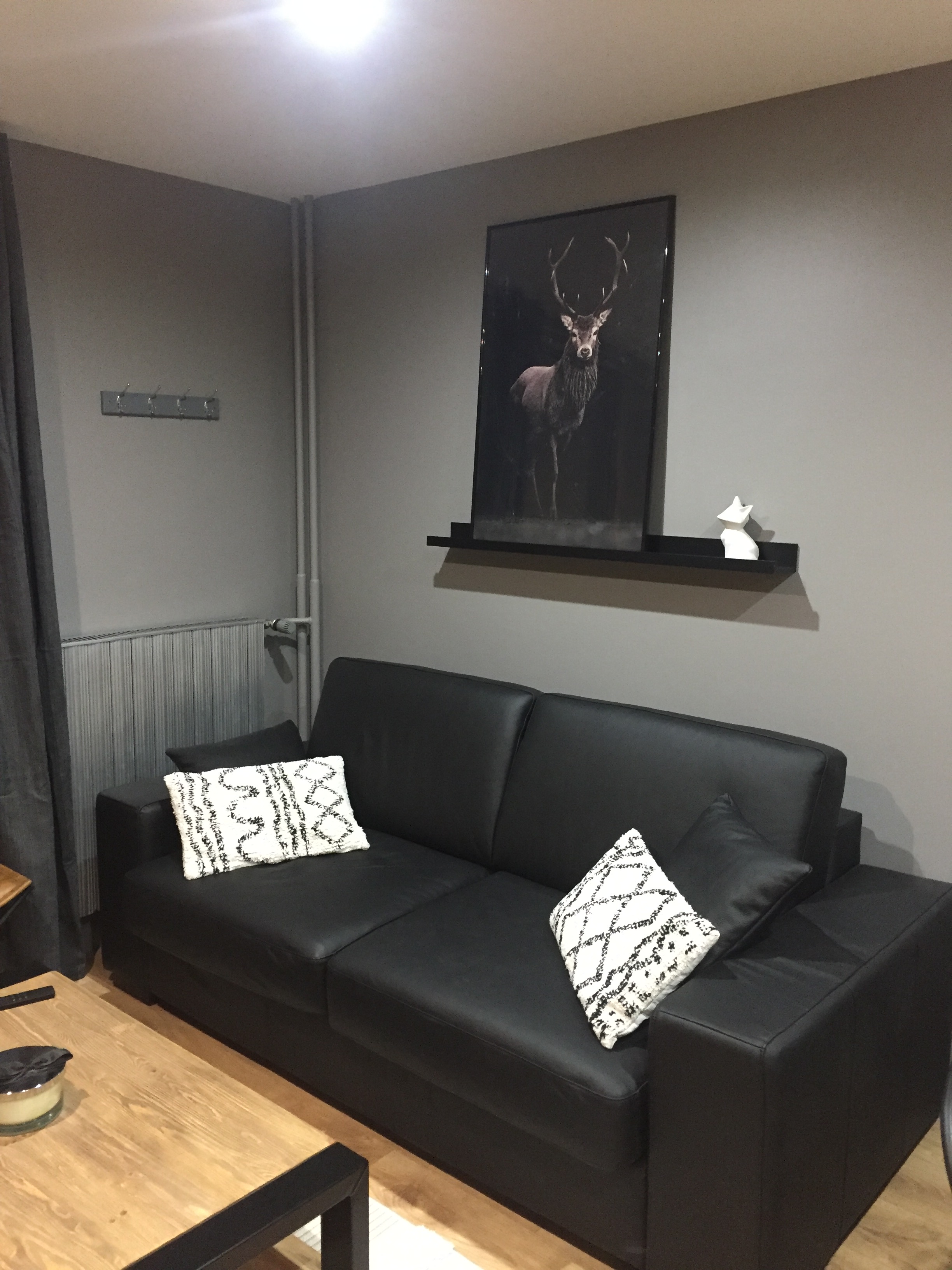 Le salon dispose d’un canapé cuir convertible rapido avec couchage 140/190, table, table basse, buffet, tv,